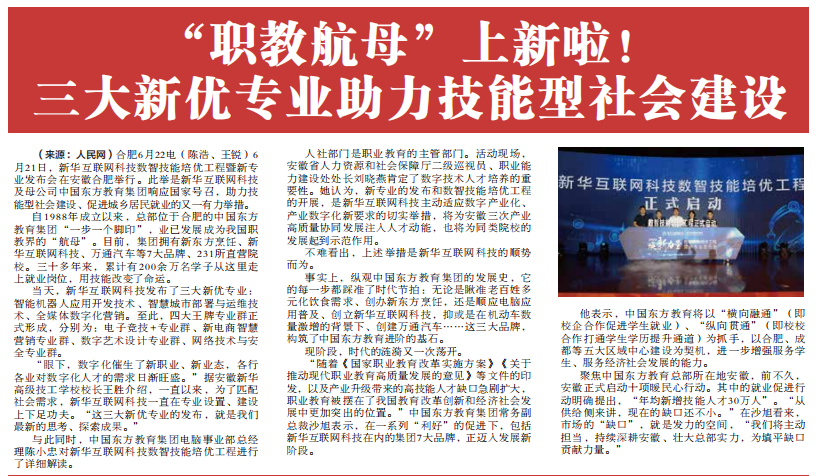 6月21日,央視(安徽記者站)、中國(guó)教育電視臺(tái)、人民網(wǎng)、合肥論壇、騰訊、知乎等多家媒體走進(jìn)新華電腦教育“創(chuàng)新啟智 校企融通”2022年數(shù)智技能培優(yōu)工程暨新專(zhuān)業(yè)發(fā)布會(huì)現(xiàn)場(chǎng),盛贊新華電腦教育在職教方面做出的再度創(chuàng)新,為數(shù)智時(shí)代新職業(yè)教育發(fā)展指明了新航向,為全面賦能復(fù)合型高素質(zhì)人才培養(yǎng),注入了新動(dòng)力、新血液!